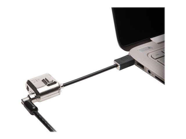 With a simple push-button action with a single hand, the lock can be inserted and firmly locked into place inside the security slot. - Cut-resistant cable